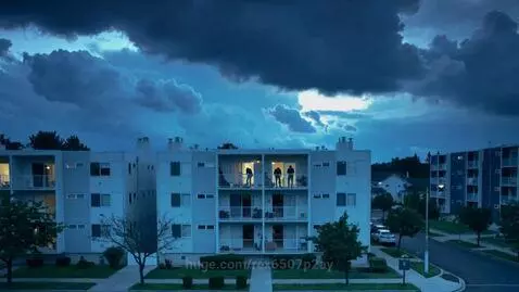 Kling 2.5 Turbo (pro) Prompt: Evening, a residential area with apartment buildings, slow-motion shooting of clouds hanging over houses, the camera slowly zooms in on the apartment window, silhouettes of residents in the window, in the frame you can see that people are hiding from the weather.