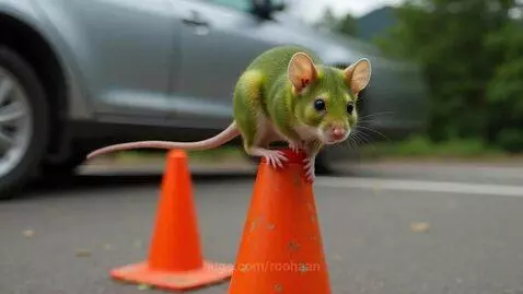 The green mouse jumps onto the traffic cone, while a car rushes by and almost knocks them over.