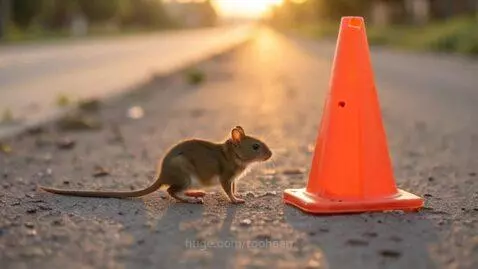 The green mouse jumps onto the traffic cone, while a car rushes by and almost knocks them over.