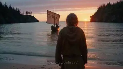 sora 2 Prompt: A man in Medieval peasant garb stands with his back to the camera at the beach of a bay going out into the ocean. The opening of the bay is in the background showing rocky cliffs and trees. The sun is half set over the horizon between the bay opening. A small canoe with a sale is floating out towards the open ocean. The word SORA is written on the sale. The scene is peaceful and sombre. The voice of a deep, older man speaks over the scene saying "Good bye, Sora. There were good times with good people."