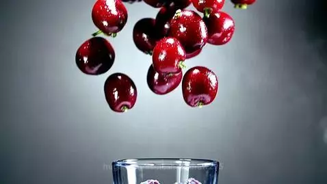 Ultra-realistic macro shot, frozen cherries falling into a glass with ice cubes, vibrant red juice splashes, dark background, cinematic lighting, slow-motion, 4k, high detail --ar 9:16 --motion 5