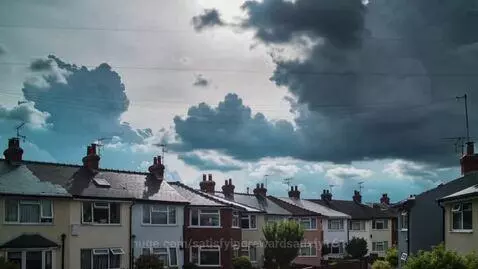 Kling 2.5 Turbo (pro) Prompt: A time-lapse of clouds hanging over houses; the camera slowly zooms in on the window of a lonely apartment. A window in the house, silhouettes of residents behind it; the scene shows that people are hiding from the weather.