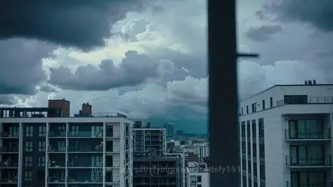 Kling 2.5 Turbo (pro) Prompt: Multi-storey buildings, slow-motion shooting of clouds hanging over houses, the camera slowly zooms in on the window of a lonely apartment, a window in the house, silhouettes of residents behind it, in the frame you can see that people are hiding from the weather.