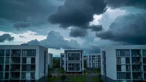 Kling 2.5 Turbo (pro) Prompt: Multi-storey buildings, slow-motion shooting of clouds hanging over houses, the camera slowly zooms in on the window of a lonely apartment, a window in the house, silhouettes of residents behind it, in the frame you can see that people are hiding from the weather.