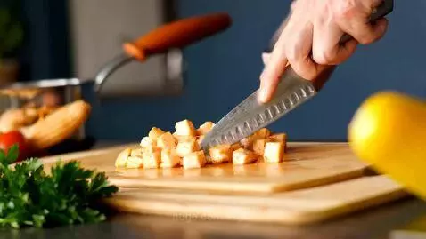 “hands cutting chicken cubes in modern kitchen, only hands visible,”