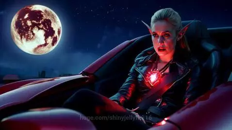 Kling 1.0 (pro) Prompt: On a full moon night, a blonde woman in a leather jacket sat in a red car, strapped in, and looked in the rearview mirror. Suddenly, she noticed that long and sharp claws began to grow on her hands. Long fangs appeared in her mouth, and her green eyes turned red. The ears were pointed and covered with hair. At that moment, she noticed a necklace with a red moonstone glowing on it. This stone, as she knew, turned its owner into a beast when the moon was full. The girl realized that she was beginning to turn into a werewolf. Her arms were covered with fur and became so huge and muscular that they tore the sleeves of her jacket. The neck became massive and wide, like a wolf's, and was also covered with hair. The jacket began to tear from the increase in body size, and the werewolf girl tore it with her huge, furry and clawed hands. She bared her toned body, covered with fur. The amulet became a part of her body and continued to glow. The girl's face distorted, she bared her wolfish teeth, fur appeared on her cheeks and forehead, and her face turned into a wolf's muzzle. She became a giant werewolf, tore the belt and broke down the door. Getting out of the car, the werewolf howled at the moon.