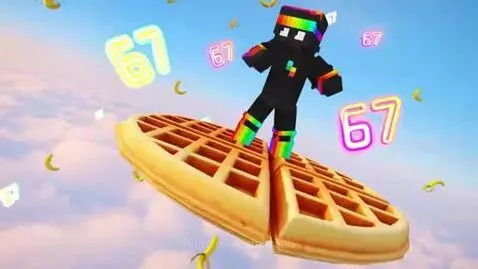 generate a video of the character in the picture flying on a waffle, with 67 inscriptions everywhere and flying bananas