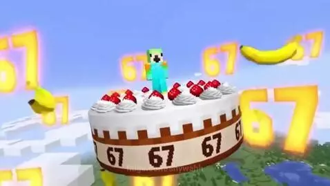 generate a video of the character in the picture flying on a cake, with 67 inscriptions everywhere, screaming "I WILL CATCH YOU RIGHT NOW, THE BEST FIGHT EVER" and flying bananas