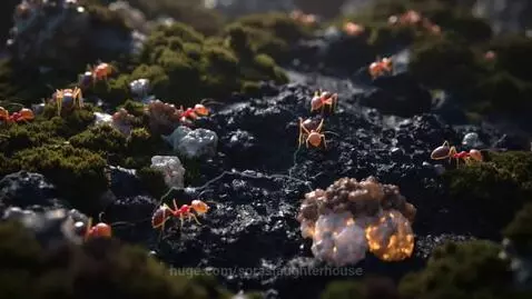 Kling 2.5 Turbo (pro) Prompt: A surreal macro view of an ant colony behaving like a living algorithm. Thousands of ants — black, red, and copper-toned — move across a forest floor made of textured soil, moss, and glowing mineral veins. Their coordinated motion forms shifting patterns and networks of light, as if guided by mathematical rules similar to Conway’s Game of Life. Each ant leaves a faint luminous trail behind, connecting to others to form transient circuits and glowing pathways. Over time, these organic paths pulse and reorganize, creating evolving geometric structures that resemble neural networks, data grids, or living constellations. The scene feels both natural and computational — a symbiosis between biology and mathematics. Occasional macro close-ups reveal the ants’ bodies reflecting subtle hues of gold and violet, while the environment breathes with slow, rhythmic light. The camera glides low and slow, tracking the colony as it self-organizes. The transitions are smooth and painterly, never mechanical — the forest seems alive with invisible intelligence. No hard CGI or artificial look: everything feels tactile and organic, but the logic underneath is abstract and precise. -- macro cinematic realism mixed with surreal bioluminescence -- painterly rendering, organic yet algorithmic motion -- soft volumetric light through moss and soil, realistic micro-textures -- luminous network trails, dynamic geometry emerging from movement -- high depth clarity, minimal bloom, crisp focus on foreground ants -- evokes collective intelligence, natural computation, and emergence of order