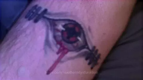 The eyeball tattoo in the picture should come to life start blinking and slowly glowin