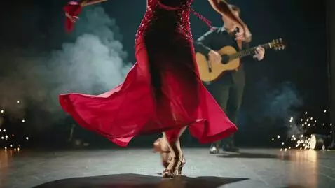 Kling 2.5 Turbo (pro) Prompt: cinematic shot of a fiery flamenco performance. A beautiful, young Spanish dancer with a curvaceous figure wears a sensual red semi-transparent dress that flows as she spins rapidly. Flamenco shoes clicking rhythmically. In the background, a musician plays passionate guitar music. Dramatic stage lighting with warm tones, dynamic movement, swirling skirt, expressive hands, intense facial expression. Slow motion moments, particle effects, smoke and light sparks. Ultra detailed, 8k, filmic style