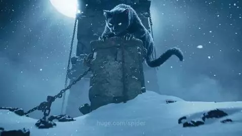 AI Prompt: Photorealistic horror meets fantasy in this chilling 15-second cinematic. Under a dark winter night, Bayun, a gargantuan black cat inspired by Russian lore, perches ominously atop a towering, weathered iron pillar. The pillar, a study in decay with its corroded surface, rusted patches, deep claw marks, and a heavy golden chain hanging loosely, sways gently in the frigid air. Shot 1 [0-5s]: The camera sweeps slowly upward from the snow-covered ground, navigating through dense fog and snowflakes, capturing distant howls and eerie creaks, all bathed in a haunting pale blue moonlight. Shot 2 [5-10s]: Eye-level close-up of Bayun's immense form, his fur clumped with frost and shrouded in mist, steel-like claws gripping the metal tightly, chest rising and falling with slow, measured breaths, tail flicking ever so slightly. Shot 3 [10-15s]: An intense extreme close-up of his face, yellow-green eyes radiating an otherworldly glow, ethereal mist escaping his pupils like wisps of smoke, lips parting in a slow, predatory grin, revealing razor-sharp fangs glistening with dew, as if uttering a cryptic incantation. Every detail is rendered in ultra-high definition, with god rays piercing the fog, subtle camera tremors adding to the unease, eerie slow motion enhancing the suspense, and stark contrasts casting dramatic shadows.