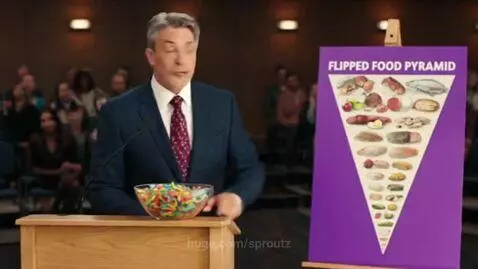 sora 2 Prompt: Animate this scene in photorealistic style: The man at the podium speaks energetically in a gravelly voice ("We're flipping the food pyramid to prioritize protein and whole foods—let's worm our way to better health!"), points to the inverted pyramid chart, grabs more colorful gummy worms from a bowl on the podium, eats a handful cheerfully with a big smile and wink to camera, gives thumbs up. Include realistic movements, audience applause sounds, upbeat music, text overlays: "2025-2030 Dietary Guidelines" and "More Protein, Less Processed Junk". End with satirical disclaimer text: "Parody for entertainment only". 12-second clip, high resolution, natural motion.