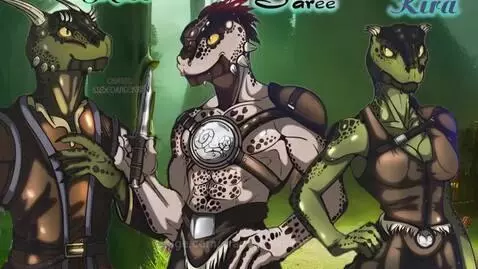 Three Argonian lizard talking to each other watch way do we take one of them pull out a map that way she says