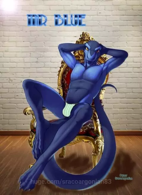 Lizard dude getting comfortable in a chair posing for pictures move has arms down then he say I am ready