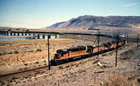 Milwaukee Road freight train getting ahead start for a grade to go up on the saddle mountain in Beverly, Wa around 1971