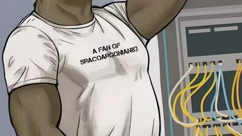 T-rex dude walks and stops looks at the server then he say come on really the wiring all mist up starts to hitting on it