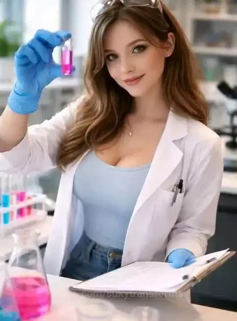 Gemini Prompt: A young European female scientist stands in a modern laboratory, holding a small vial with pink liquid. She drinks it.