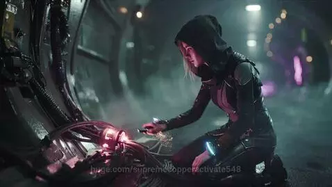 Kling 2.5 Turbo (pro) Prompt: Style: 2099 year. Cyberpunk cinematic short film, ultra-detailed, photorealistic, realistic lighting and materials, volumetric light and shadow, soft depth of field, HDR, 8K quality. Color palette: deep cyan, magenta, violet and cold neon tones with soft ambient haze. Atmosphere: moody, reflective, slightly melancholic but filled with inner strength. Textures: wet asphalt, glass reflections, flickering holograms, metallic surfaces, neon bokeh. Camera setup: Anamorphic lens, cinematic framing, shallow focus, low-angle or mid-shot depending on emotion, realistic motion blur, light flares and particle effects. Optional drone sweeps or slow panning for environmental shots. Lighting: Mixed neon and ambient backlight with secondary reflections. Use red or purple accent lights for emotional tension, blue or teal for calm introspection. 4. "Pulseline Hack" Inside a maintenance tunnel beneath the main network spine. Hooded young woman kneels near a junction of glowing cables, connecting her wrist port. Sparks and data particles swirl around. A short burst of overload lightens her face — calm, focused, determined.