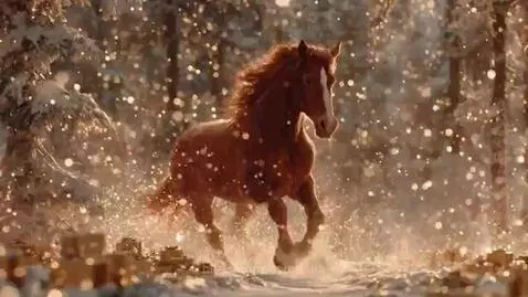 A horse gallops to celebrate the New Year. Two more horses join her, rushing to celebrate the New Year. At the end of the video, the numbers 2026, covered with snowflakes, appear from an opaque state. Fun and fabulous music is playing.