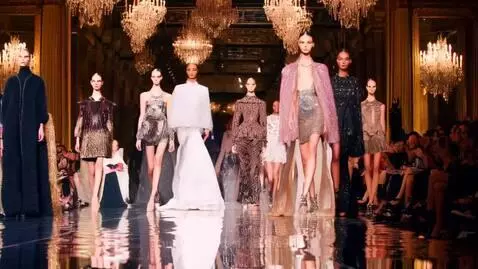 MiniMax Director Prompt: High-fashion runway in New York City, glamorous models walking, flashing lights, chaotic scene as a tiny dog wearing sunglasses causes a model to trip, laughter and shocked faces, cinematic fashion photography style, Vogue magazine lighting, motion blur, funny and stylish.