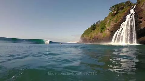 a surfer surfs down a waterfall into the ocean and then catches a wave and keeps surfing