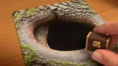 sora 2 Prompt: The frame shows a table with a large photograph on it. The photograph depicts a section of tree trunk with a large tree hollow. Static/fixed camera shot, focus on the tree hollow. In the bottom right corner, a hand briefly enters the frame and places a treasure chest at the bottom right side of the tree hollow, then the hand exits the frame. A red-hatted gnome first pokes his head out, eyes looking left and right, then shows a greedy smile, glances at the camera, and looks left and right again. Using both hands, he gently picks up the treasure chest to confirm it. The red-hatted gnome grabs the treasure chest and smoothly retreats back into the hole in one continuous motion, movements are smooth and fluid, with natural weight and physics.