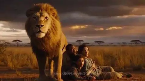 A majestic lion standing protectively in front of frightened people, calm .
