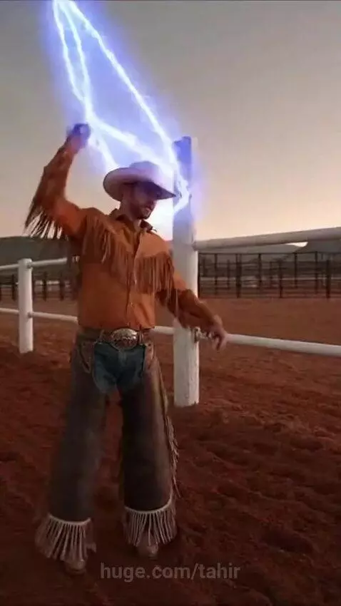 Action: Instead of a rope, he is twirling a lasso made of pure, crackling, blinding blue laser light. He throws the laser loop, and it seamlessly slices clean through a thick wooden fence post before snapping back to his hand.