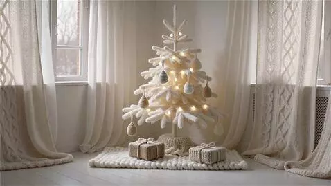 Кинематографическое видео 9 на 16 белая комната по хлопку наряжается к новому году: ёлка, гирлянды, подарки под елкой, мягкие шторы на окнах, пушистый коврик на полу и всё это как будто связанное спицами.