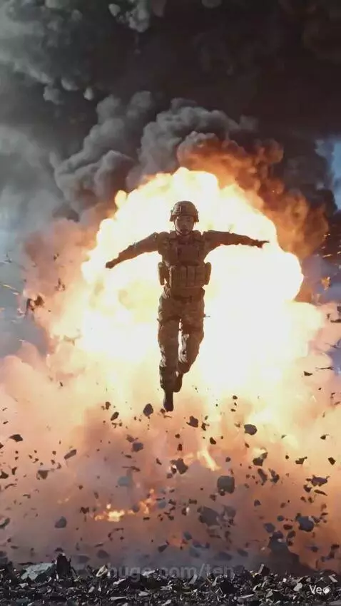 Cinematic Explosion “5-second cinematic war scene, slow motion—soldier dives as a massive explosion erupts behind him, dust and fire filling the frame, intense lighting, ultra-realistic, dramatic camera shake.”