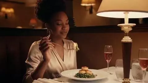a slim black woman eating at a fancy restaurant. montage of her eating food and growing fatter. at the end she is 800 lbs