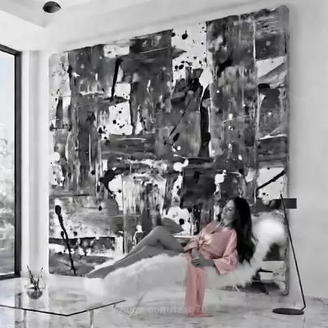 A beautiful long dark-haired woman in a soft blush outfit stands in a modern black, white, and gray room. Behind her is a massive abstract painting made of thick, chunky acrylic paint.