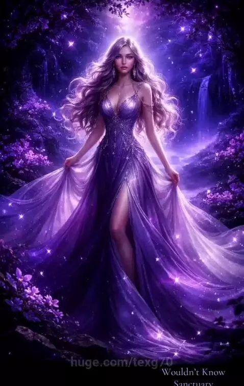 Lead: Ethereal woman from your image (long flowing hair, purple gown) Setting: Dark violet enchanted forest + glowing water Style: Realistic, cinematic, soft particles, NO fantasy creatures, NO unrealistic elements Mood Arc: Hidden → Controlled → Rising → Untouchable