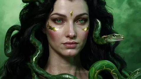 Kling 1.0 (standard) Prompt: A cinematic close-up shot of a Medusa-like woman in a dark fantasy setting. Her face is calm and regal, with soft porcelain skin, glowing green eyes, and subtle golden serpent markings on her cheeks and forehead. Her long, dark curly hair is alive with green serpents that gently move and twist like living creatures. Camera pans slowly from front to side, focusing on her intense gaze and the slow, fluid motion of the snakes. The background is a soft green mist with ethereal lighting. Realistic textures, subtle breathing, slow motion, fantasy goddess atmosphere. Wind softly moves through her hair. Dramatic, mythological mood. 4K cinematic detail, speaking slowly