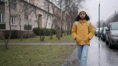 Young Girl Walks on Wet Sidewalk