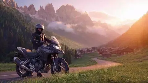 sora 2 Prompt: Create a short animated video with these scenes: Mountain village at sunrise: Man in riding gear next to on/off motorcycle Benelli TRK 502, mountains in background, warm sunrise glow, trees, small houses, winding road. Soft nature sounds and gentle music. Riding through mountains: Motorcycle on winding mountain road, tall snow-capped peaks, rocky cliffs, pine trees, engine and wind sounds. Approaching a lake: Motorcycle slows at calm lake reflecting mountains, rider stops and gazes. Clear water, small boats, peaceful scenery. Water sounds and soft music. Entering the city: Night city scene with tall buildings, busy streets, bright lights, rider navigating urban traffic, city sounds, upbeat music. Riding into sunset: Rider on scenic road towards horizon with golden sunset, city in distance, symbolizing adventure. Uplifting music and wind. End with text: "Adventure awaits. Keep riding."