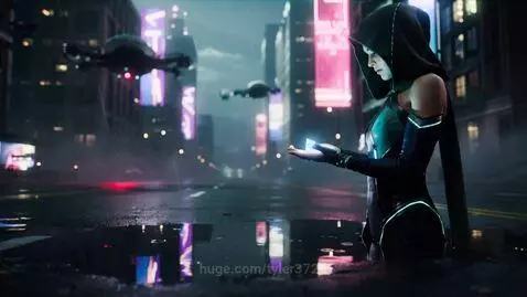Kling 2.5 Turbo (pro) Prompt: Style: 2099 year. Cyberpunk cinematic short film, ultra-detailed, photorealistic, realistic lighting and materials, volumetric light and shadow, soft depth of field, HDR, 8K quality. Color palette: deep cyan, magenta, violet and cold neon tones with soft ambient haze. Atmosphere: moody, reflective, slightly melancholic but filled with inner strength. Textures: wet asphalt, glass reflections, flickering holograms, metallic surfaces, neon bokeh. Camera setup: Anamorphic lens, cinematic framing, shallow focus, low-angle or mid-shot depending on emotion, realistic motion blur, light flares and particle effects. Optional drone sweeps or slow panning for environmental shots. Lighting: Mixed neon and ambient backlight with secondary reflections.Scene 21.2 Cyberpunk street at night under acid rain. Hooded young woman drops a glowing data shard on wet pavement — a fake packet. Reflections of red and blue neon ripple in puddles. Surveillance drones hover in the distance, silent observers of a test no one knows is happening.