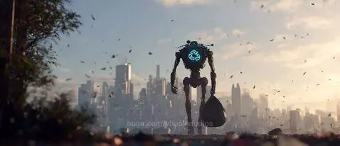 AI Prompt: Unreal Engine 5, 32K HD cinematic render, low-angle dramatic shot of a recycling robot lifting a heavy trash bag, glowing neon recycle logo shining above, futuristic eco-city skyline in the distance, cinematic golden-hour rim lighting, trash particles suspended mid-air.