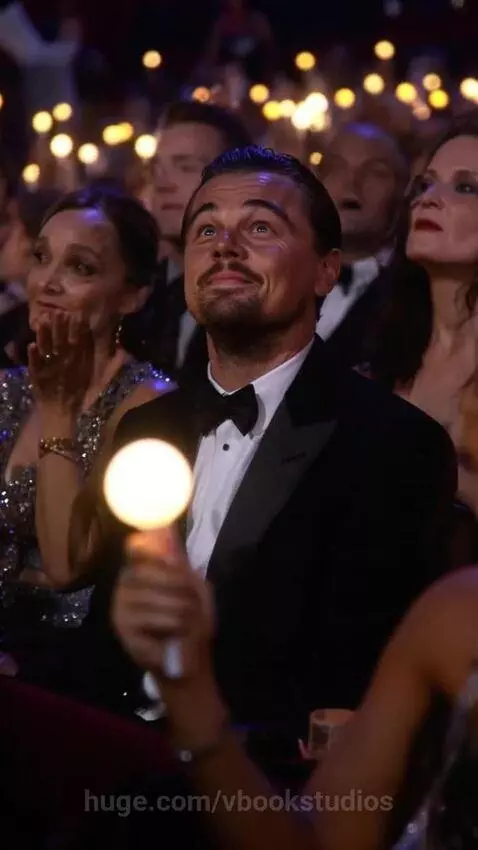 AI Prompt: Leonardo DiCaprio holding light stick during Academy Awards K-Pop performance, wearing tuxedo, mustache but no beard, light stick fits in person's hand with handle not an actual stick, lights have golden glow, inside theater --ar 51:91 --bs 2 --raw --video 1