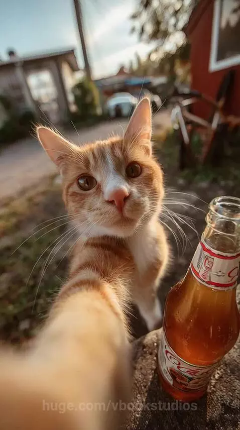 fotografia selfie de gato anaranjado tomando con una botella de gaseosa en la pata --ar 51:91 --motion low --raw --video 1