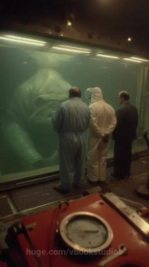 AI Prompt: This grainy, realistic color photograph captures the dimly lit interior of a sterile experimental tank in a top-secret facility. Three men in light blue protective suits, white boots, and transparent face shields, along with two other VIPs in suits, stand in front of the tank's glass, observing a green, writhing alien creature emerging from the dim environment. In the foreground, a red metallic object with a circular window or instrument panel is visible, partially obscuring the creature's blurred upper body. The creature's skin is white, the lighting is somewhat dim, and the focus is on the grotesque details of its head and upper body. The men appear to be monitoring its movements. A metallic walkway surrounds the tank. This crudely colored image gives the impression of an old, discovered photograph documenting a strange and potentially dangerous object within a top-secret research facility. --ar 51:91 --video 1