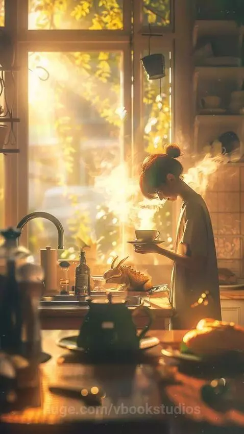 AI Prompt: cozy anime kitchen sunrise, young person making coffee, small cute dragon sitting at table breathing tiny flame to toast bread, warm golden light, soft shadows, steam rising, pastel color palette, studio ghibli inspired, highly detailed, cinematic composition, 35mm lens, depth of field, soft lighting --ar 51:91 --video 1