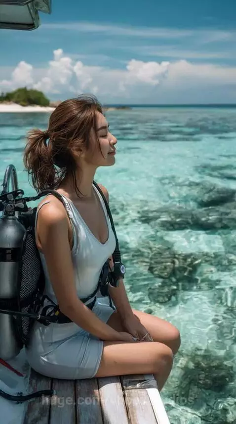 AI Prompt: Back view of a young asian female scuba diver, sitting on the edge of a modern dive boat, she is wearing sleeveless white wetsuit, with scuba dive gears, sunny day with blue sky, the ocean water is crystal clean, a tropical island blur background. --ar 51:91 --bs 2 --motion high --raw --video 1