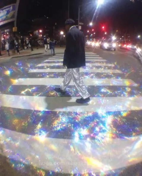 A guy I a mysterious color pattern walking across a cross walk in space --ar 4:5 --bs 1 --motion low --video 1