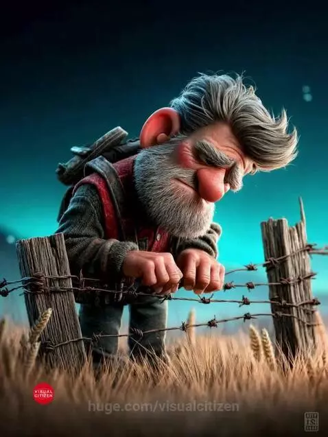 A man struggles to fix a broken wire fence.