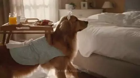 Create a dog making breakfast for his owner while he is sleep and brings him breakfast in bed like the dog is the maid