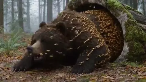 The whole swarm of bees pulls the bear out of the den