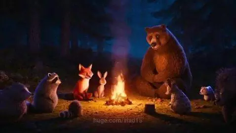 At night in the forest, animals gather in a circle around a fire and tell each other scary stories. Realistic video with a zoomed-in camera.