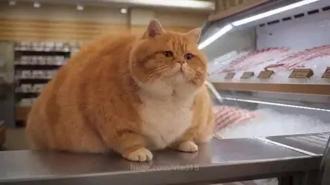 A very fat cat stands behind the counter of the fish department in a store, and next to it there is a display refrigerator in which fish bones are neatly arranged.